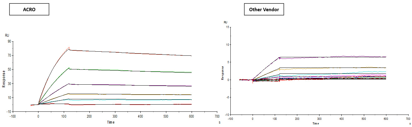 Binding activity of Human CD19, His Tag from two different vendors were evaluated by SPR assay against FMC63 MAb. The result showed that ACRO's Human CD19, His Tag can bind FMC63 MAb with an affinity constant of 2.95 nM which is much higher than that of the other vendor.