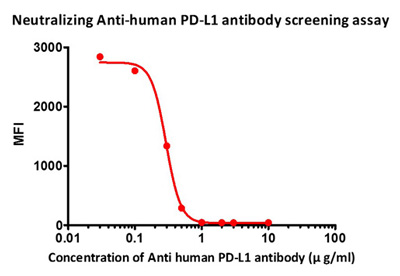 FACS analysis shows that the binding of PE-Labeled Human PD-1, Fc Tag, His Tag (recommended for neutralizing assay) (Cat. No.PD1-HP2F2) to 293T overexpressing PD-L1 was inhibited by increasing concentration of neutralizing antihuman PD-L1 antibody. The IC50 is 0.29 μg/ml (QC tested).