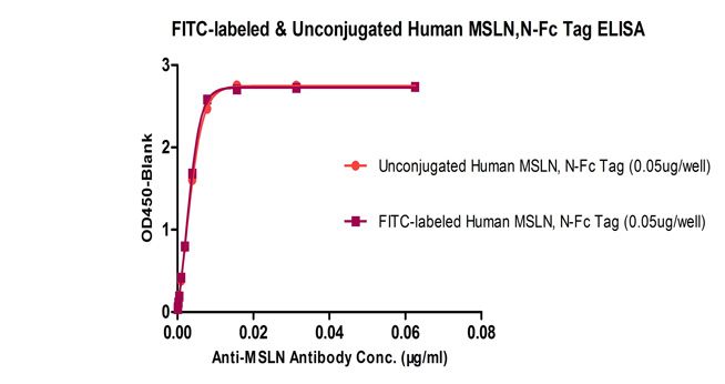Binding activity of the Human MSLN, Fc Tag before and after FITC labeling was evaluated in the above ELISA analysis. The result shows that FITC-Labeled and Unconjugated Human MSLN, Fc Tag have almost the same level of binding activity.