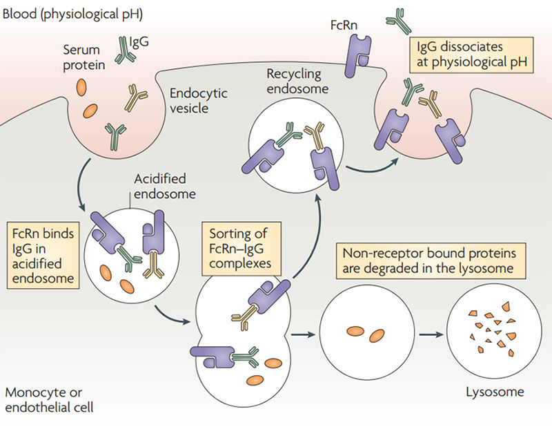 Schematic diagram of FcRn-mediated IgG and serum protein recycling