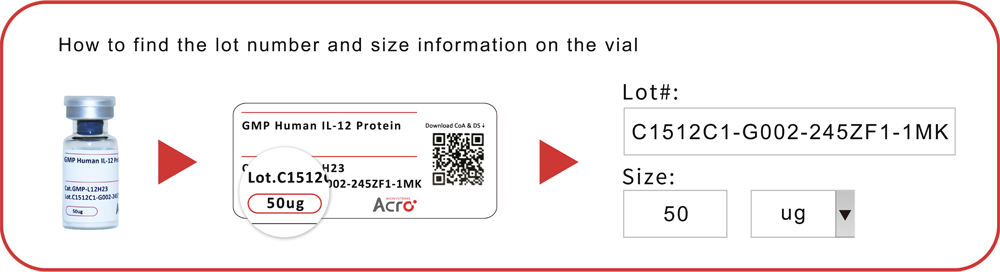 *Please select the correct product unit size from the drop-down menu. If the box does not appear, wait for the webpage to finish loading. E.g., If the product that you purchased is in unit size of 1 mg but is supplied as 4 vials of 250 μg, you would enter 250 and select μg as the size.
